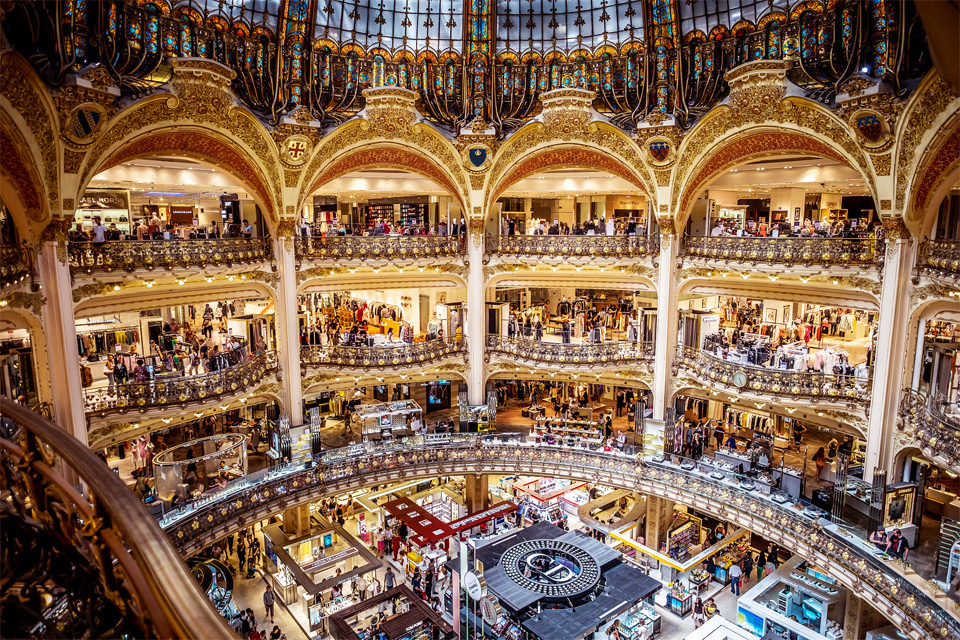 Місце паломництва модників з усього світу, в якому представлені колекції всіх прославлених французьких дизайнерів. В кінці XIX століття це була невелика галантерейна крамниця площею всього 70 квадратних метрів, але вже через два десятиліття Лафайєт розрісся до торгового центру, який займає цілий квартал. Галерея однією з перших почала застосовувати сучасний маркетинг: яскраві вивіски, великі вітрини та знижки. Окрасою будівлі став чудовий скляний купол в неовізантійському стилі.