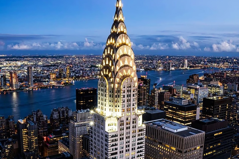 Елегантний 320-метровий хмарочос в стилі арт-деко, який на момент відкриття в 1930 році став найвищою будівлею світу. Крайслер-Білдінг проектувався як штаб-квартира однойменної автомобільної корпорації, що відобразилося на зовнішньому вигляді споруди. Хмарочос вінчає семиярусна «корона» з полірованої нержавіючої сталі, яка своїм дизайном нагадує колісні диски найдорожчої моделі Крайслера того часу. Ще однією архітектурною родзинкою будівлі стали розміщені на фасаді скульптури, схожі на горгулів з готичного собору.