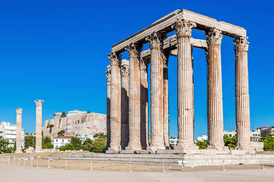 Залишки найбільшого храму Стародавньої Греції, що за своїми розмірами перевершив легендарний Парфенон. Святилище оточували 104 колони заввишки 17 метрів, з яких до наших днів збереглися лише 15. Всередині споруди знаходились дві не менш монументальні статуї. Перша була зроблена з слонової кістки та золота і уособлювала головного бога Олімпу Зевса. Друга, трохи скромніша скульптура, створювалася на честь римського імператора Адріана, який завершив будівництво храму. На жаль, обидві статуї були знищені в візантійську добу.