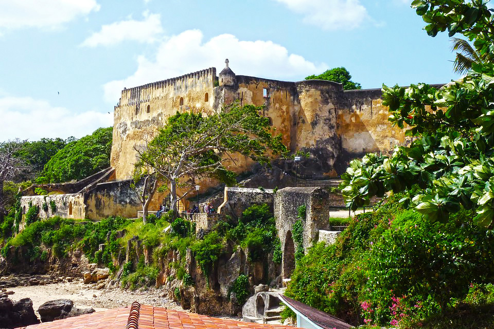 Колишня португальська фортеця, зведена на узбережжі Індійського океану для контролю над морськими шляхами між Європою і Азією. Назва Форт Ісус виникла як символ португальської християнської місії на мусульманському сході Африки. З висоти архітектурний комплекс нагадує людину, тіло якої – це основна частина укріплення, а голова, руки та ноги – оборонні бастіони. Фортеця неодноразово переходила від португальців до турків і назад, поки, в кінці XIX століття, не була захоплена британцями. В наш час Форт Ісус перетворений на філіал Національного музею Кенії.